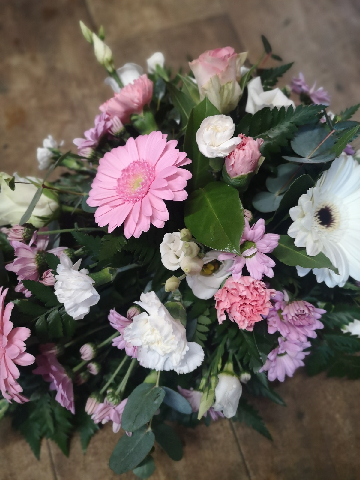 Our floral unique spray includes germini, gerbra, carnations, eustoma, spray carnations roses and chrsythamums and foilages