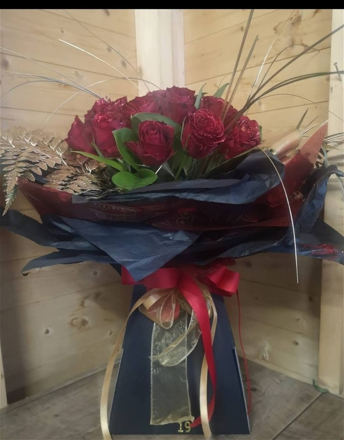 Fresh red roses gift wrapped in black red gold packaging with a sprinkle of glitter packaging may vary of design